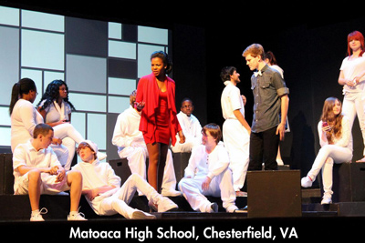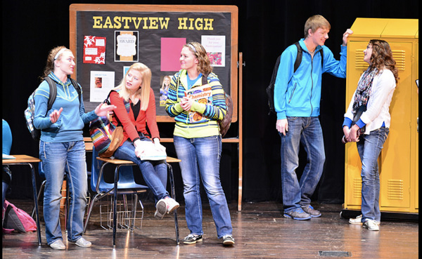 There are different set designs in each image, the first has a set that looks like a classroom on one side and a hallway with lockers on the other side. The second set has boxes for actors to sit or stand on providing levels. The last set uses chairs for the actors to interact with and has a plain black background.